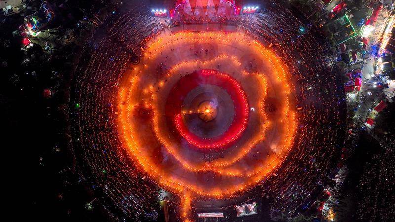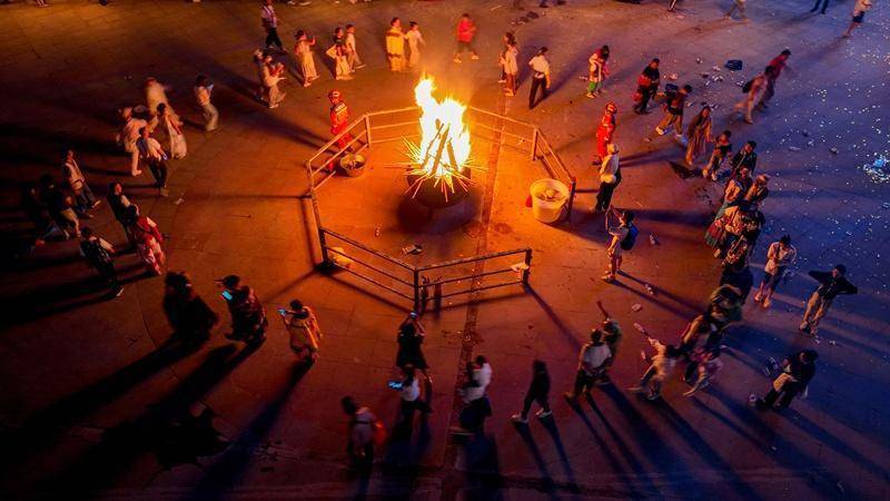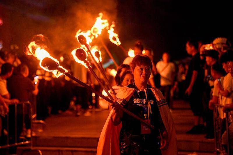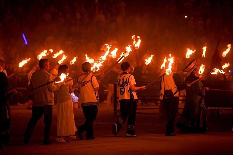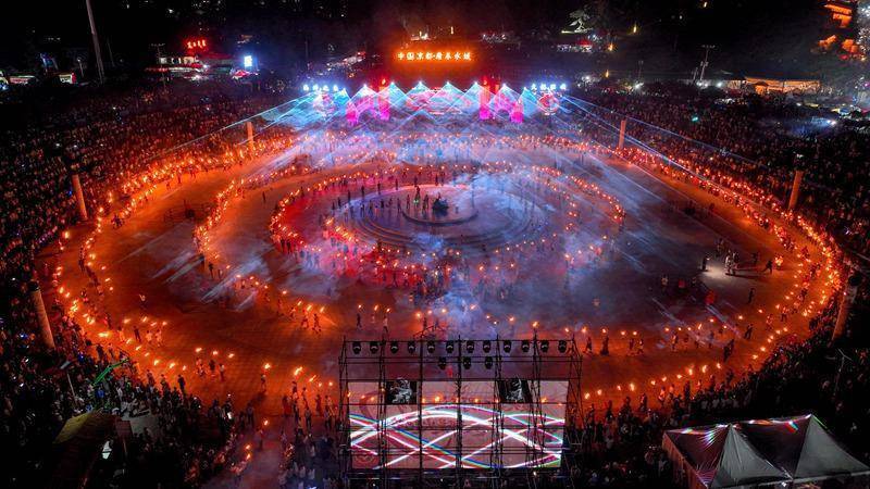 活动现场,随着倒计时归零,数十火堆轰然亮起。万千火把次第点燃,广场化作流动火河,巡游队伍蜿蜒行进。篝火旁人群环绕,各地游客携手起舞。