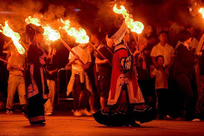 7月18日晚,2025贵州野玉海·海坪彝族火把季在六盘水市水城区野玉海国家级旅游度假区海坪文化小镇开幕,上万名游客齐聚一堂,巨型火把点燃野玉海夏夜。
