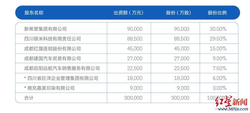 截至2024年末,新希望集团有限公司持股30%,是其最大股东;第二大股东为北京小米电子软件技术有限公司旗下的四川银米科技有限公司,持股比例为29.5%;第三大股东为成都红旗连锁股份有限公司,持股比例为15%;此外,成都建国汽车贸易有限公司、成都启阳远航汽车销售服务有限公司、四川省巨洋企业管理集团有限公司、南充嘉美印染有限公司分别持有9%、7.5%、6%、3%股权。